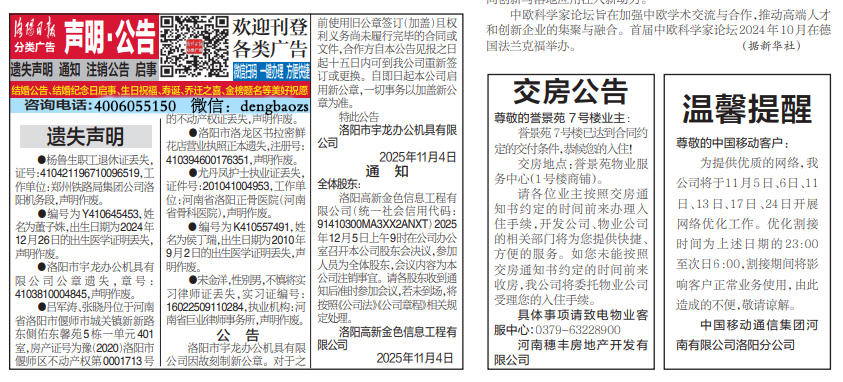 洛阳日报在线办理:遗失声明 通知 注销公告 启事。结婚公告、结婚纪念日启事、生日祝福、寿诞、乔迁之喜、金榜题名等美好祝愿。