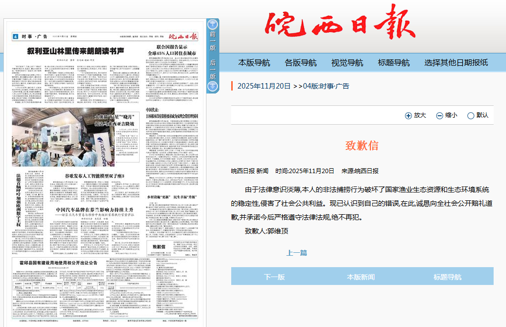 由于法律意识淡薄,本人的非法捕捞行为破坏了国家渔业生态资源和生态环境系统的稳定性,侵害了社会公共利益。现已认识到自己的错误,在此,诚恳向全社会公开赔礼道歉,并承诺今后严格遵守法律法规,绝不再犯。 致歉人:郭维顶