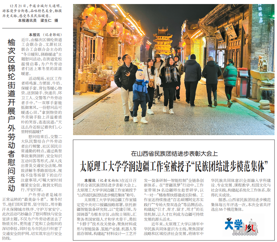 本报讯 (记者宋向红)在近日召开的全省民族团结进步表彰大会上,太原理工大学学润边疆工作室被授予“山西省民族团结进步模范集体”称号。
