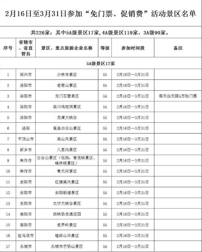 目前,全省共有226家景区参加2月16日至3月31日的首道门票免费活动,占全省收费A级景区的82%。其中,洛阳市共有38家A级景区对全国游客免门票,其中,5A级景区5家,4A级景区22家,3A级景区11家。