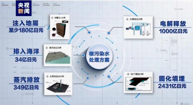 日本政府专家组发布的报告中,曾经提出过注入地层、排入海洋、蒸汽排放、电解释放、固化填埋等五种方案。表上统计的成本造价显示,排入海洋花费最少。
